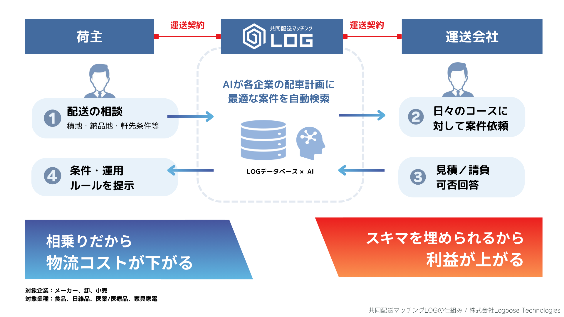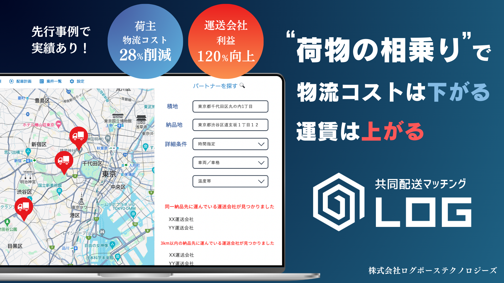 “荷物の相乗り”で2024年の物流課題を解決:ログポースが共同配送をコーディネートする「共同配送マッチングLOG」を正式リリース – 物流費28%削減と運送利益120%向上の両立を実現した先行事例あり